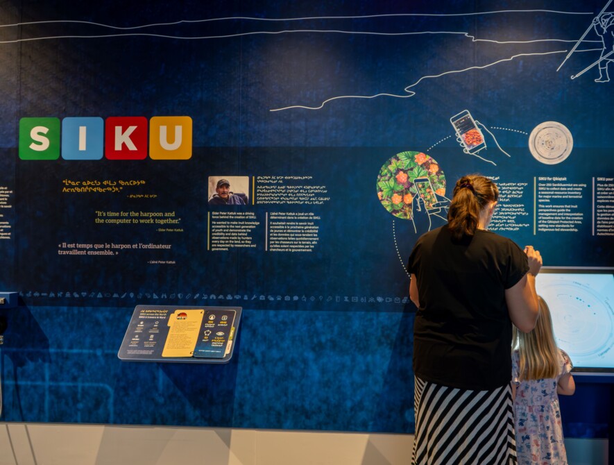 L’application mobile SIKU, qui signifie « glace de mer » en inuktitut a été créée par la Société des eiders de l’Arctique pour les communautés autochtones. Une section de l’exposition vise à faire découvrir cet outil numérique utilisé par plus de 40 000 personnes de l’Alaska au Groenland. Cette technologie offre notamment aux usagers des moyens garantissant la sûreté des déplacements et la transmission des connaissances sur des sujets tels que la chasse, la cueillette de petits fruits, la pêche et les changements climatiques.