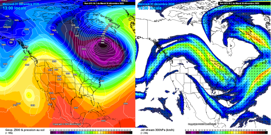 Modélisations de la pression atmosphérique où l’on distingue le morceau de vortex polaire sur le Québec (carte de gauche) et trajectoire du courant jet polaire (carte de droite) le 31 décembre 2025.