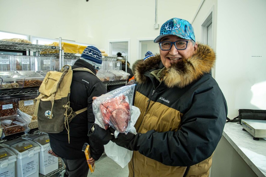 Iqaluit, 28 février 2025. Vice-président de NTI, Paul Irngaut pose fièrement avec des morceaux de caribou achetés lors de l’inauguration du magasin de nourriture traditionnelle Qinnirvik,