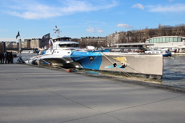 Le navire Sea Sheperd, avec une proue à l’effigie de Brigitte Bardot, amarré sur les quais de Seine à Paris en 2015. Le trimaran est resté 11 ans dans la flotte de l’organisation fondée par Paul Watson.