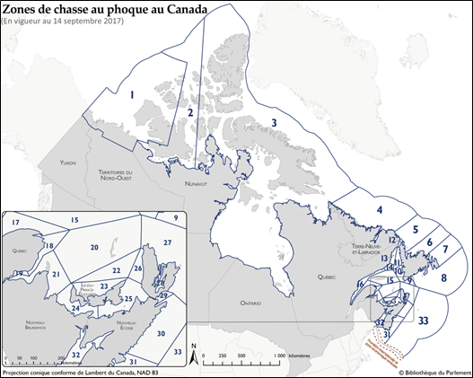 Les zones de chasse réparties au Canada.