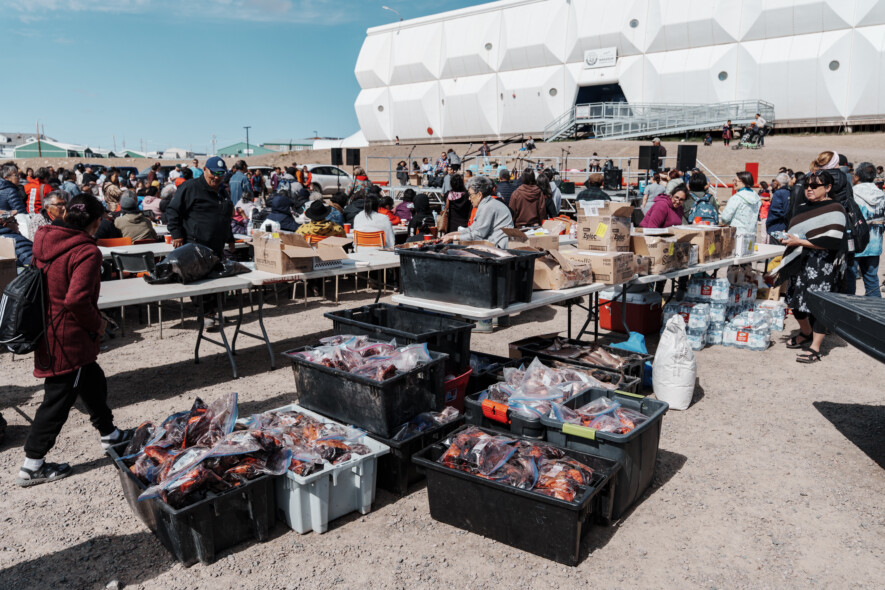 De la viande de phoque est partagée devant l’école Nakasuk, lors de la Fête du Nunavut