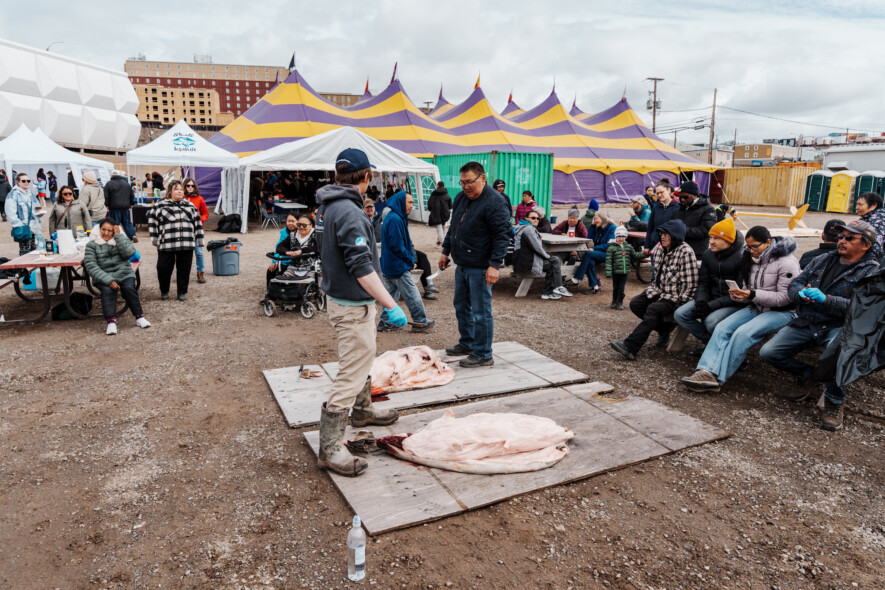 Lors du festival des arts inuit Alianait qui s’est déroulé en juin dernier, deux phoques s’apprêtent à être découpés et partagés dans un festin communautaire.