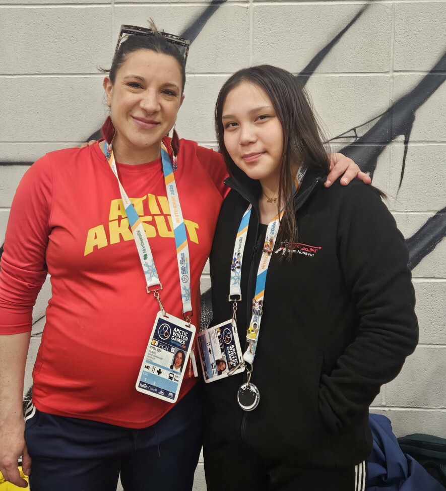 À gauche, l’entraineuse de Futsal Chelsea Dubiel – à droite, la joueuse de futsal Kara Owpalook, toutes les deux venues du Nunavut pour les Jeux d’Hiver de l’Arctique.