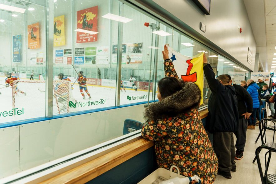 Des supporters inuit encouragent le Nunavut en inuktut lors d’un match de hockey. et arborent fièrement les couleurs du territoire.